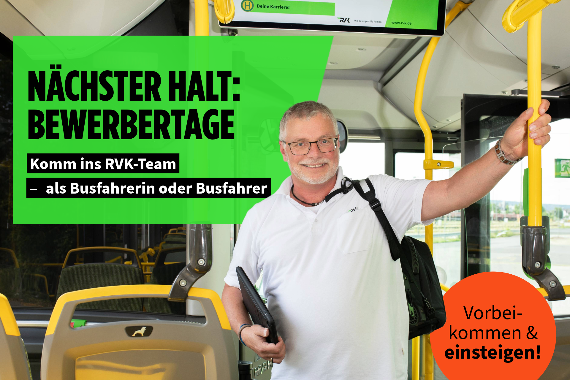Die Bewerbertage der RVK gehen 2026 in die nächste Runde und Du bist herzlich eingeladen! Komm vorbei, dreh selbst eine Runde mit unserem Fahrschulbus und sichere dir danach den Job als Fahrpersonal bei der RVK - auch als Quereinstieg ohne Busführerschein!